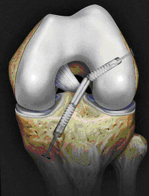 Das Sehnentransplantat wird durch je ein Bohrloch im Unterschenkel- und im Oberschenkelknochen in das Kniegelenk passgenau eingezogen und im Knochen mit Spezialschrauben, die sich selbst auflösen, befestigt.